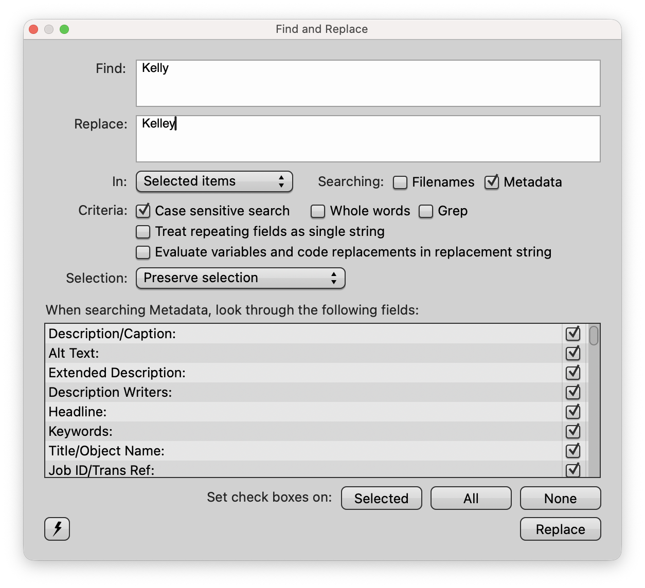You can use variables and code replacements in the replacement string, and you can save your settings as a snapshot. Because the Replace feature replaces all instances, it's important to be as selective as possible with the fields you choose to replace.