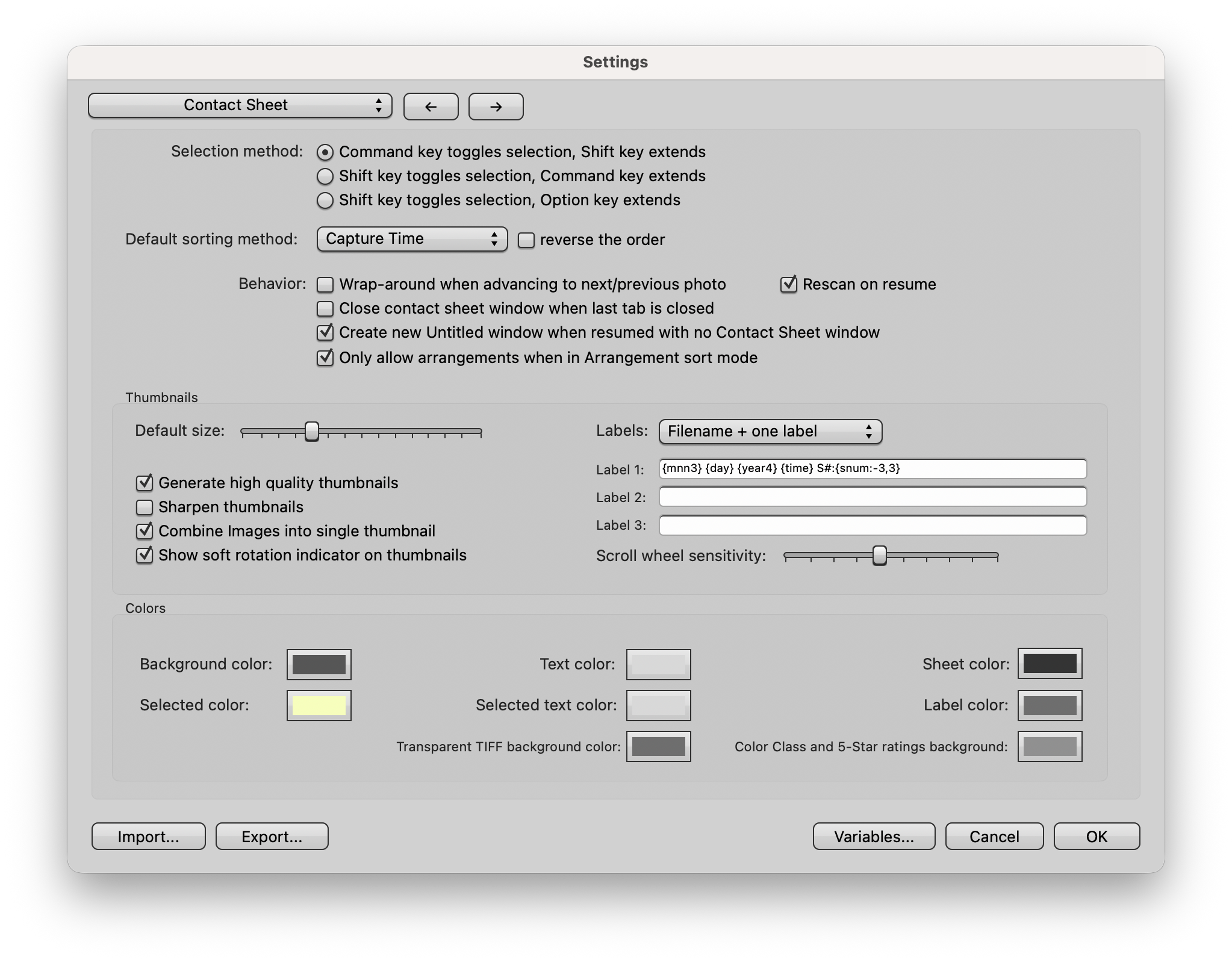 Scroll wheel sensitivity: (macOS only) Controls the amount that the mouse scroll wheel moves the screen while viewing the Contact Sheet.