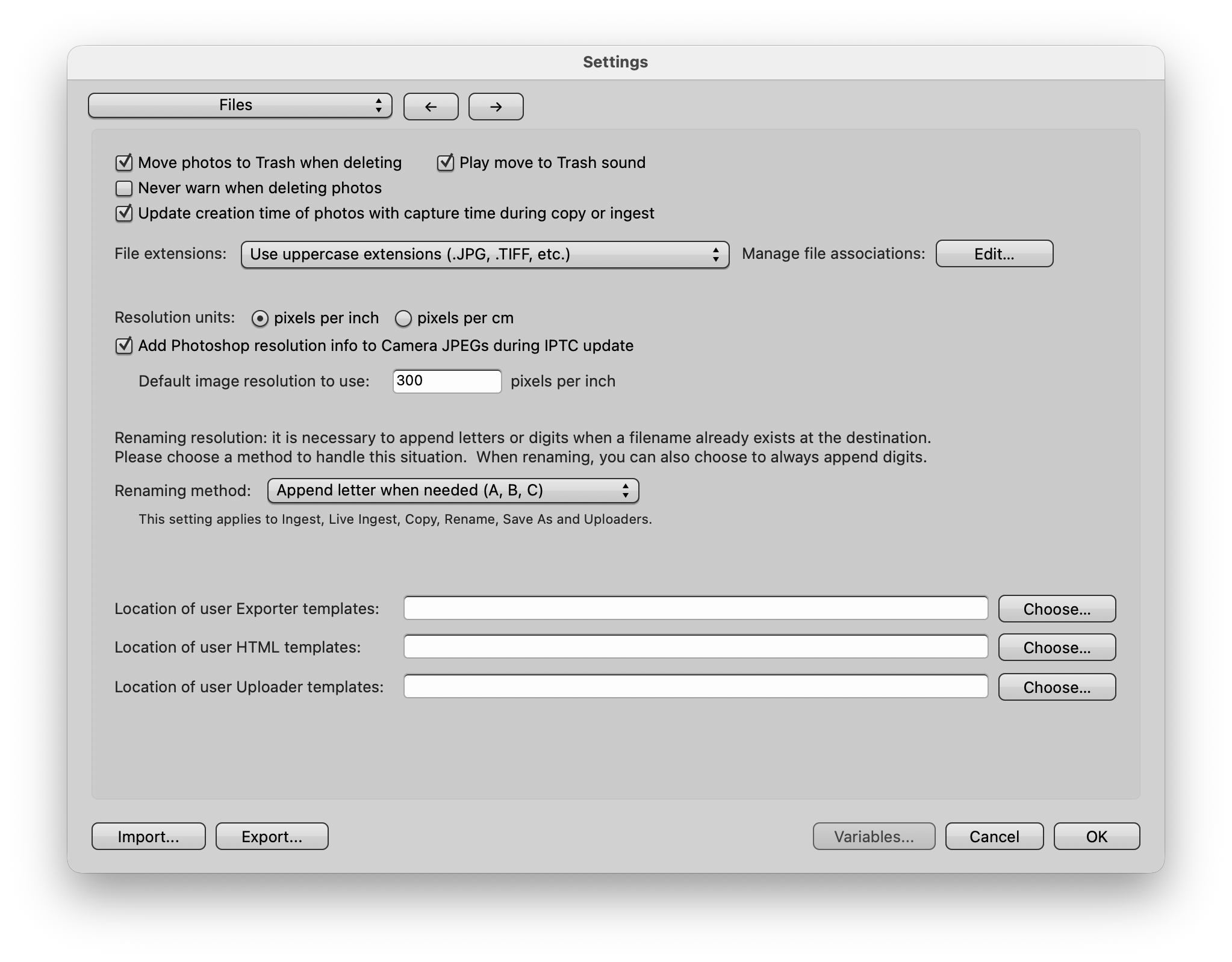 Renaming resolution: Set options for what Photo Mechanic should do when it tries to save a file to a folder and there is already a file with the same name. This policy applies to all renaming operations. You can choose to append a letter, or a single or double-digit number.